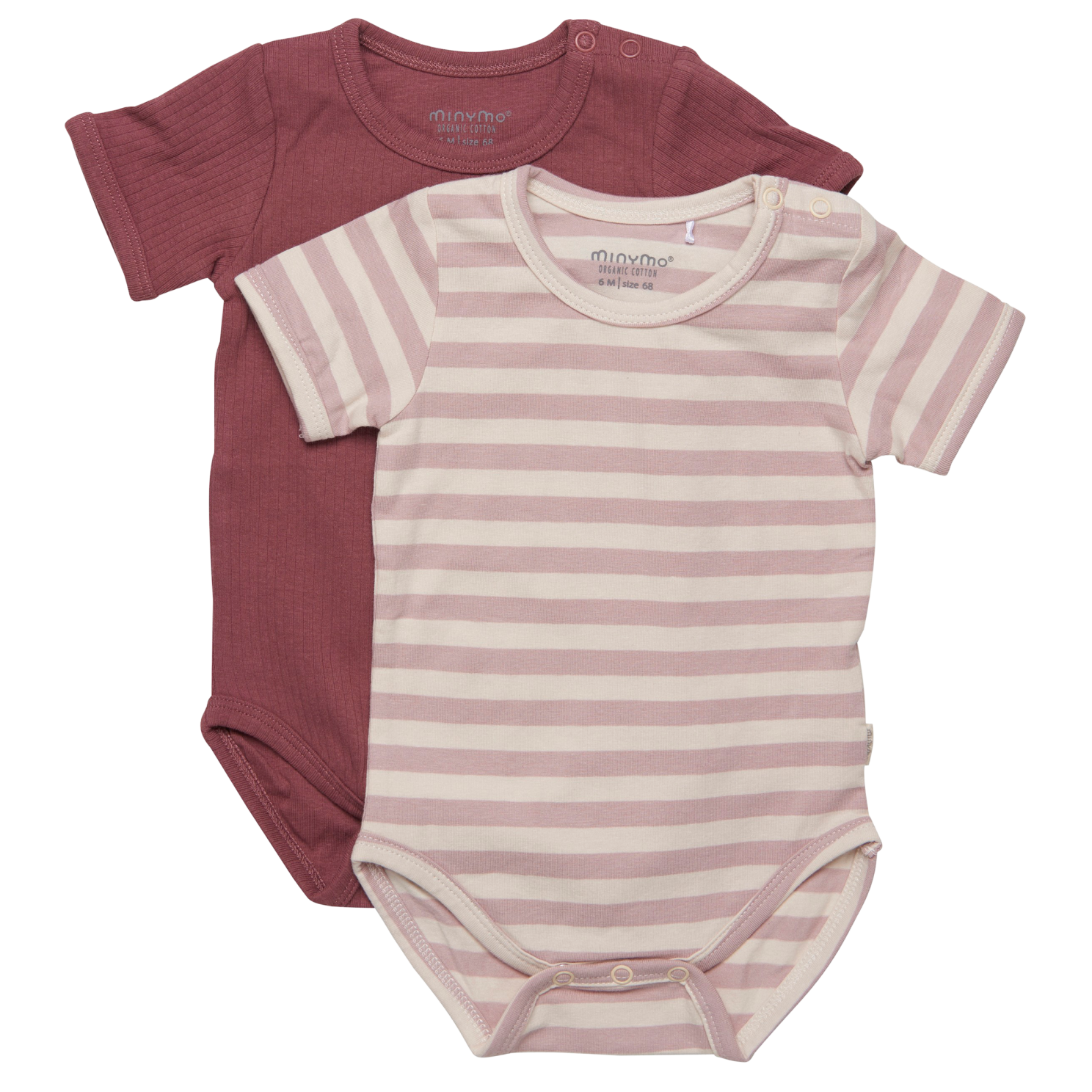 Minymo 2-pack kortærmede baby bodystockings til de små. Pakken består af en body med striber og en ensfarvet bodystocking. Denne bodystocking har to trykknapper ved halsåbningen for nem af – og påklædning, samt 3 trykknapper ved skridtet, så det er let a.