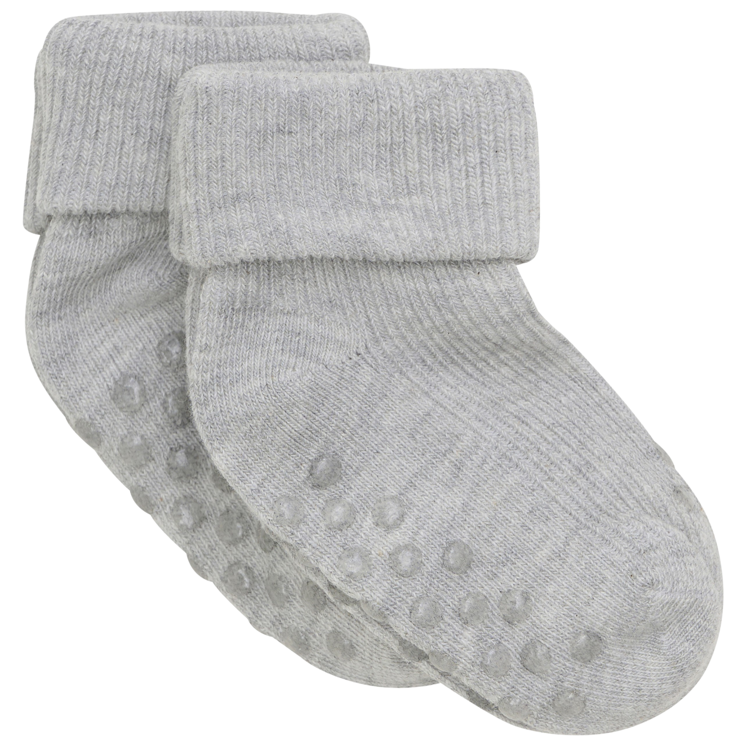 Minymo 2-pak med skridsikre strømper til de mindste. Strømperne har skridsikker bund samt gummi dutter på oversiden af foden, som gør det nemmere for barnet at stå fast, når det skal lære at kravle og gå..
