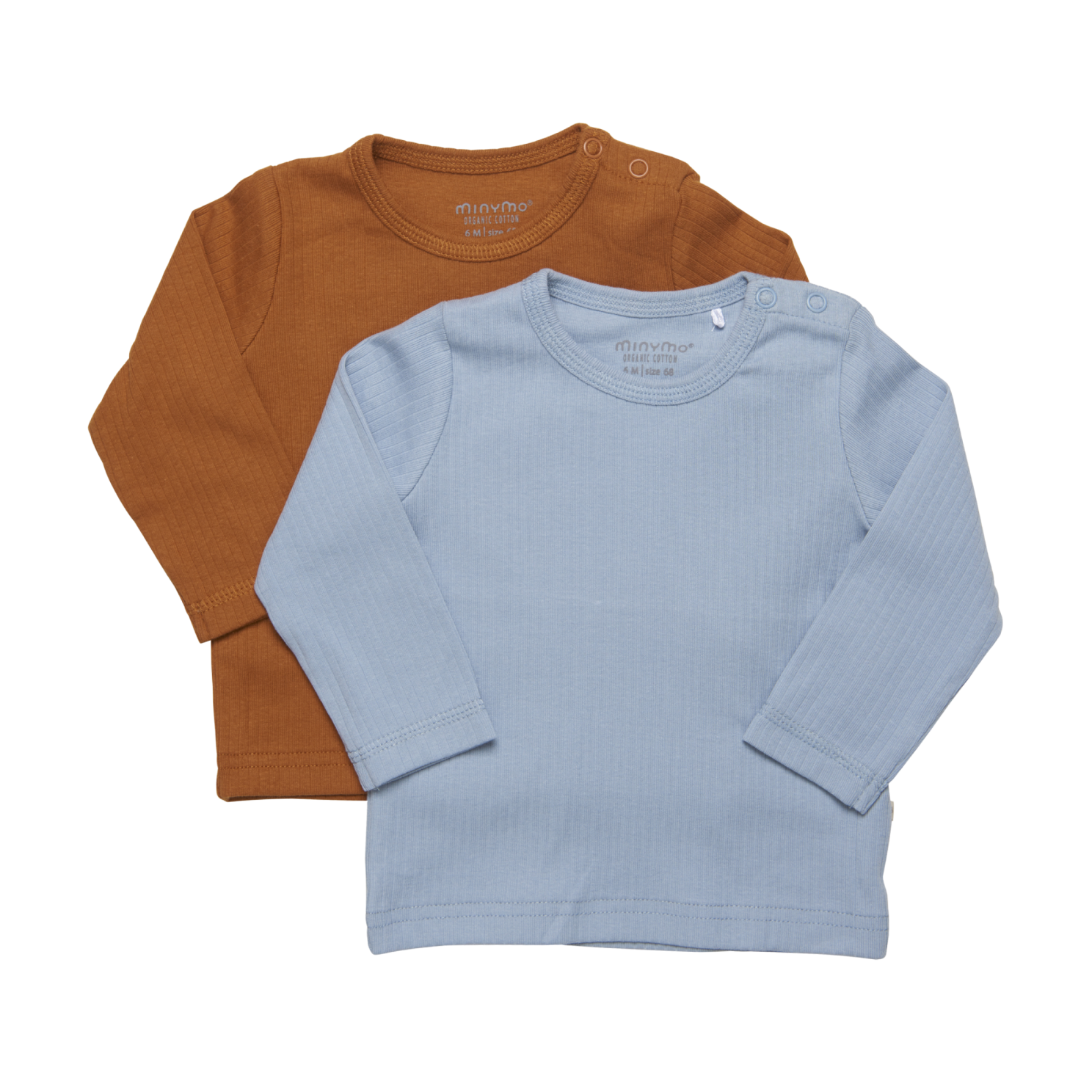 Minymo 2-pak børne bluse i økologisk bomuld. To super fine langærmede bluser med rund halsudskæring og knapper i halsen, så bluserne er lette at tage af og på. Bluserne er lavet i rib-look og er af økologisk bomuld. Bluserne er i en super lækker kvalitet.