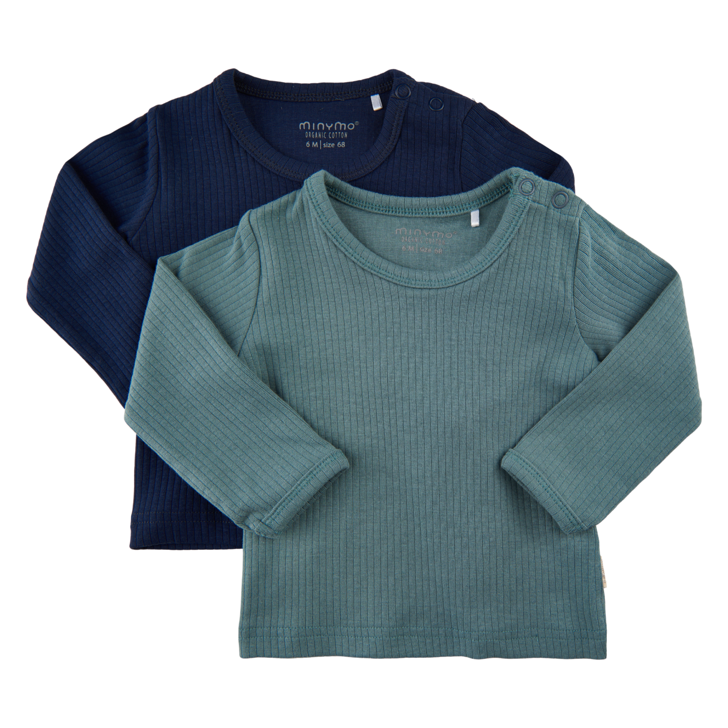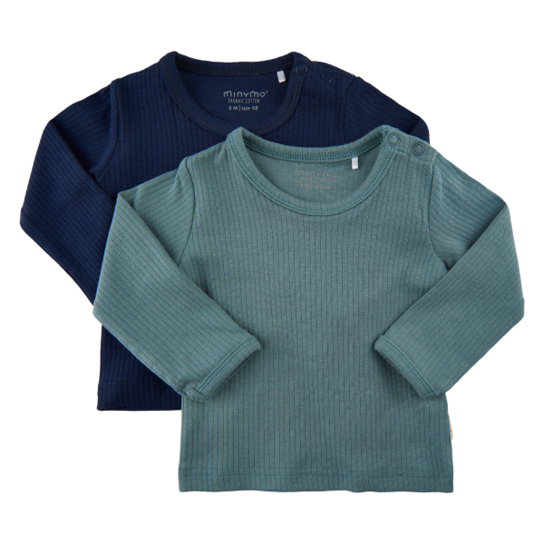 Minymo 2-pak børne bluse i økologisk bomuld. To super fine langærmede bluser med rund halsudskæring og knapper i halsen, så bluserne er lette at tage af og på. Bluserne er lavet i rib-look og er af økologisk bomuld. Bluserne er i en super lækker kvalitet.