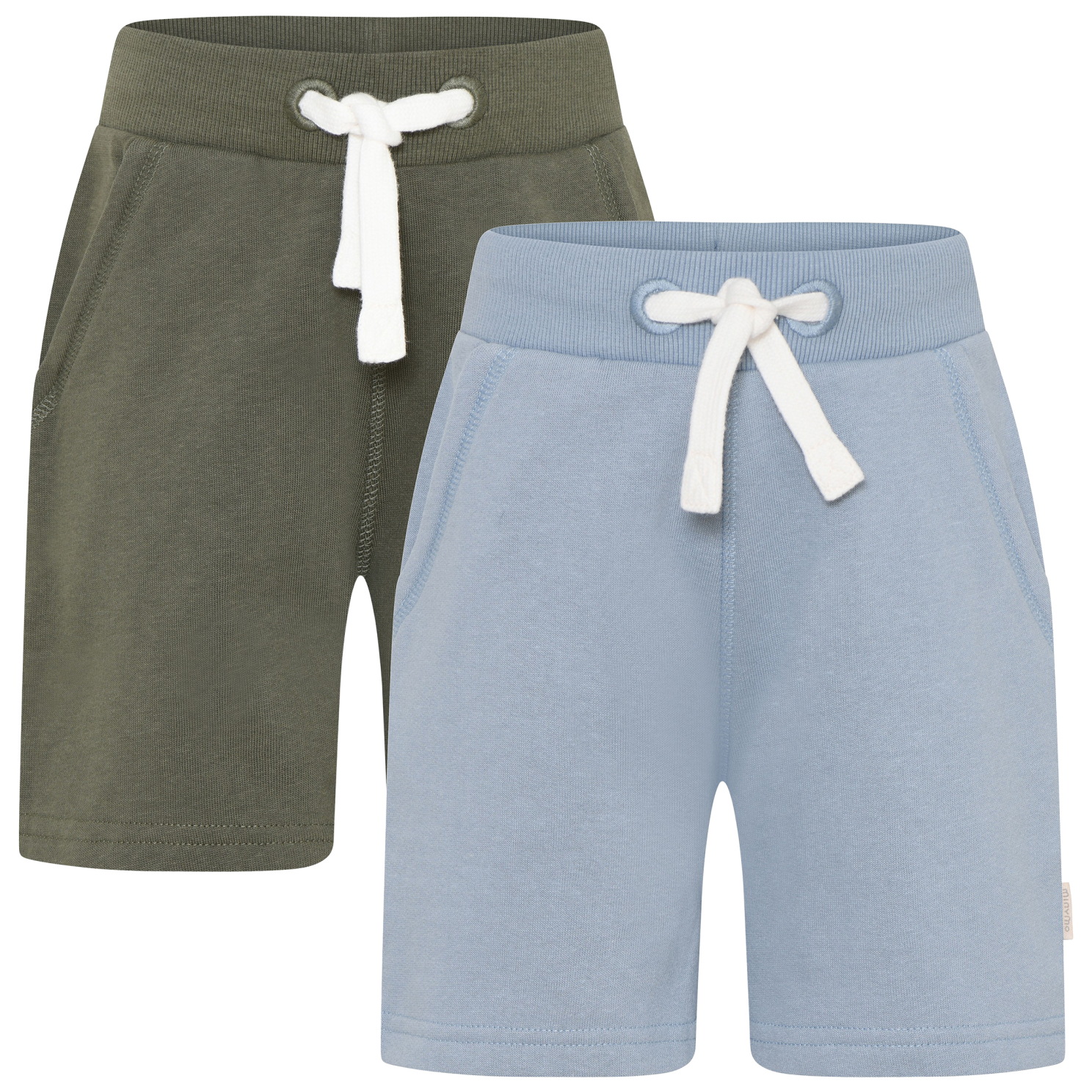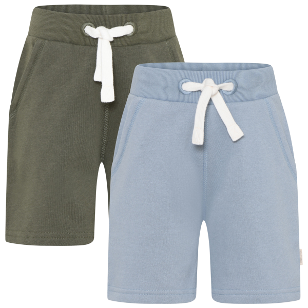 Minymo 2-pak med to par sweat shorts. Begge par shorts har rib og bindebånd i taljen, samt to skrålommer..