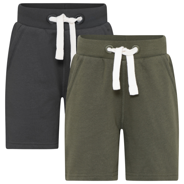 Minymo 2-pak med to par sweat shorts. Begge par shorts har rib og bindebånd i taljen, samt to skrålommer..