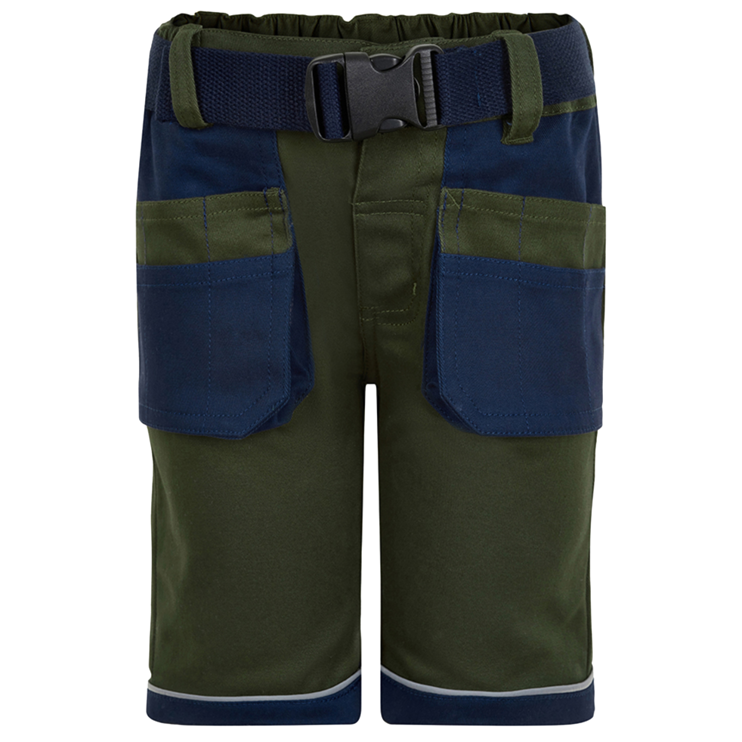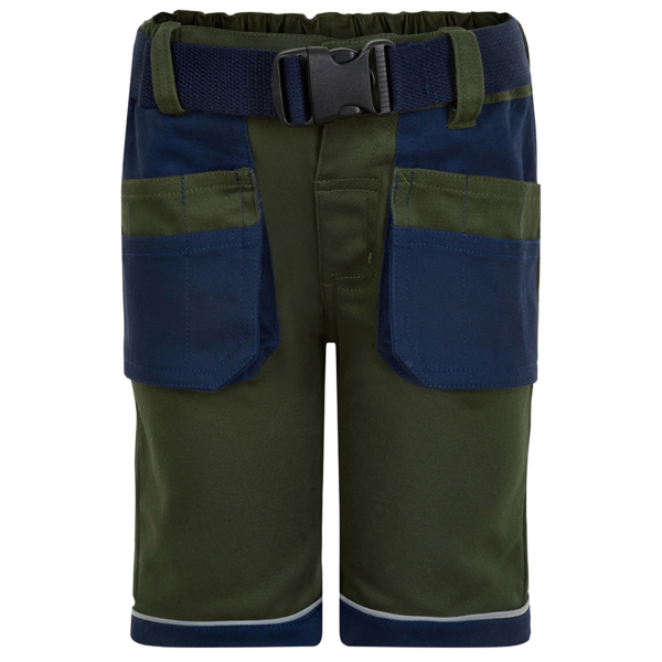 Minymo børne arbejdsshorts med reflekser om lårene. Shortsene har lommer foran og bagpå, samt spænde om taljen. Bukserne lukkes med lynlås og trykknapper. Bukserne er slidstærke og strækbare..