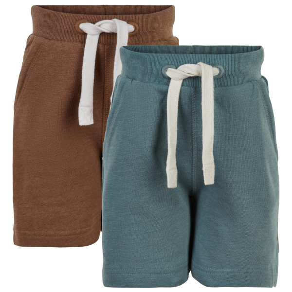 Minymo 2-pak med to par sweat shorts. Begge par shorts har rib og bindebånd i taljen, samt to skrålommer..