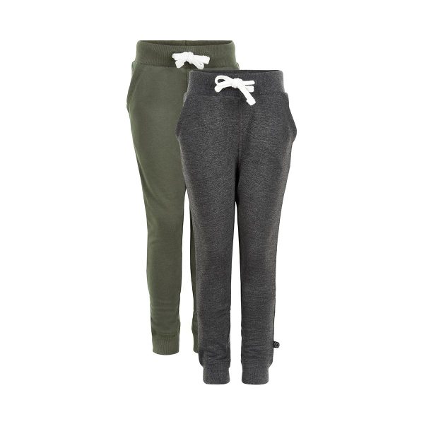 Minymo børne sweatbukser 2-pak. To par lækre sweatbukser med elastik og bindebånd i taljen, to skrå lommer samt ribkant ved hofte og ankler..