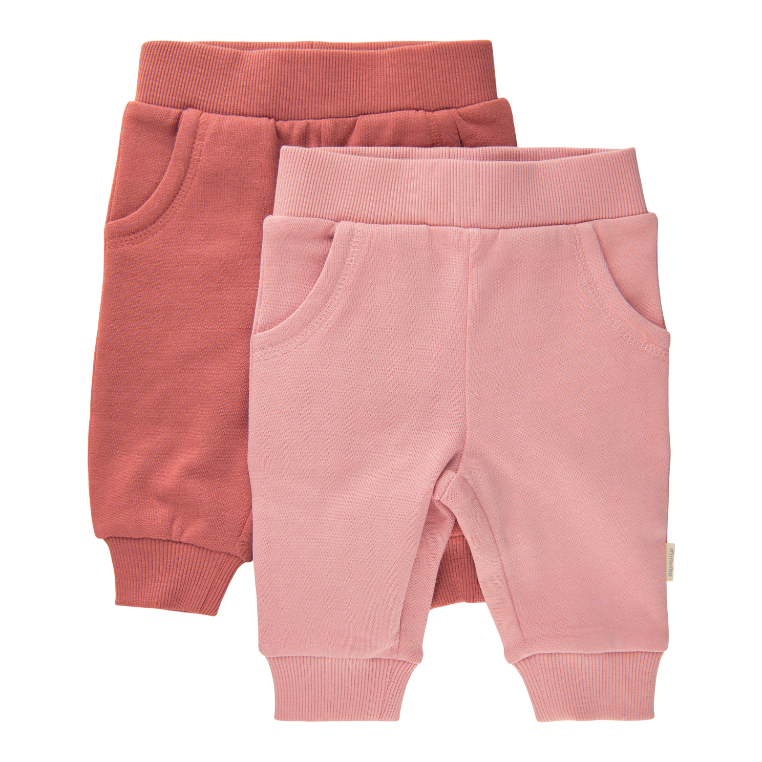 Minymo baby sweatpants 2-pak. Virkelig lækre bukser til baby med blød børstet inderside og elastisk ribkant i taljen. Bukserne har to skrå lommer, en i hver side. I buksebenene er der ribkant til at lukke tæt om anklerne. Bukserne er ensfarvet..