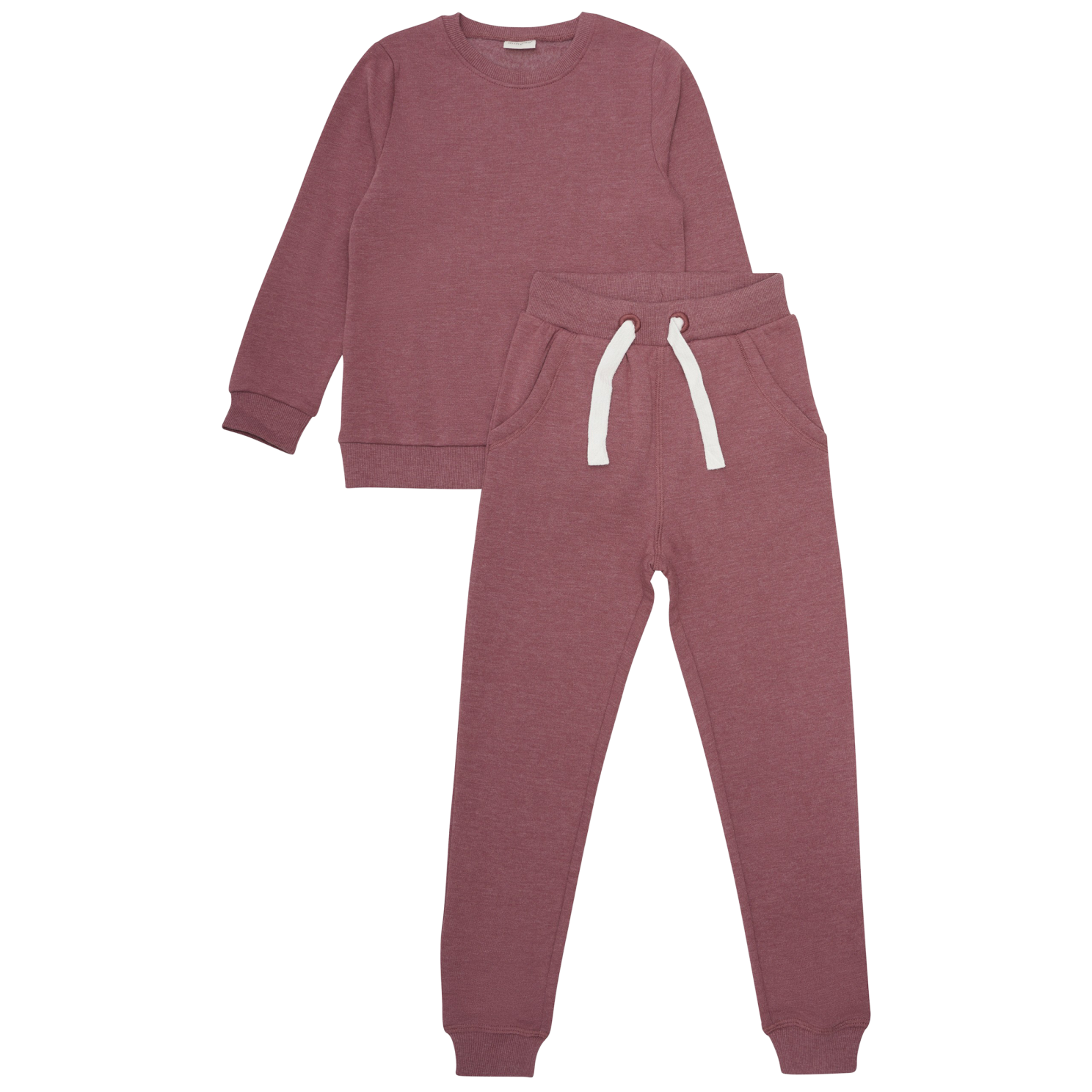 Minymo børne sweatsæt. Lækkert sweatsæt bestående af en langærmet bluse og bukser med blød børstet inderside. Sweatshirten har rund halsudskæring samt ribkant ved hals, hofte og ærmegab. Bukserne har elastik og bindebånd i taljen, to lommer samt ribkant v.