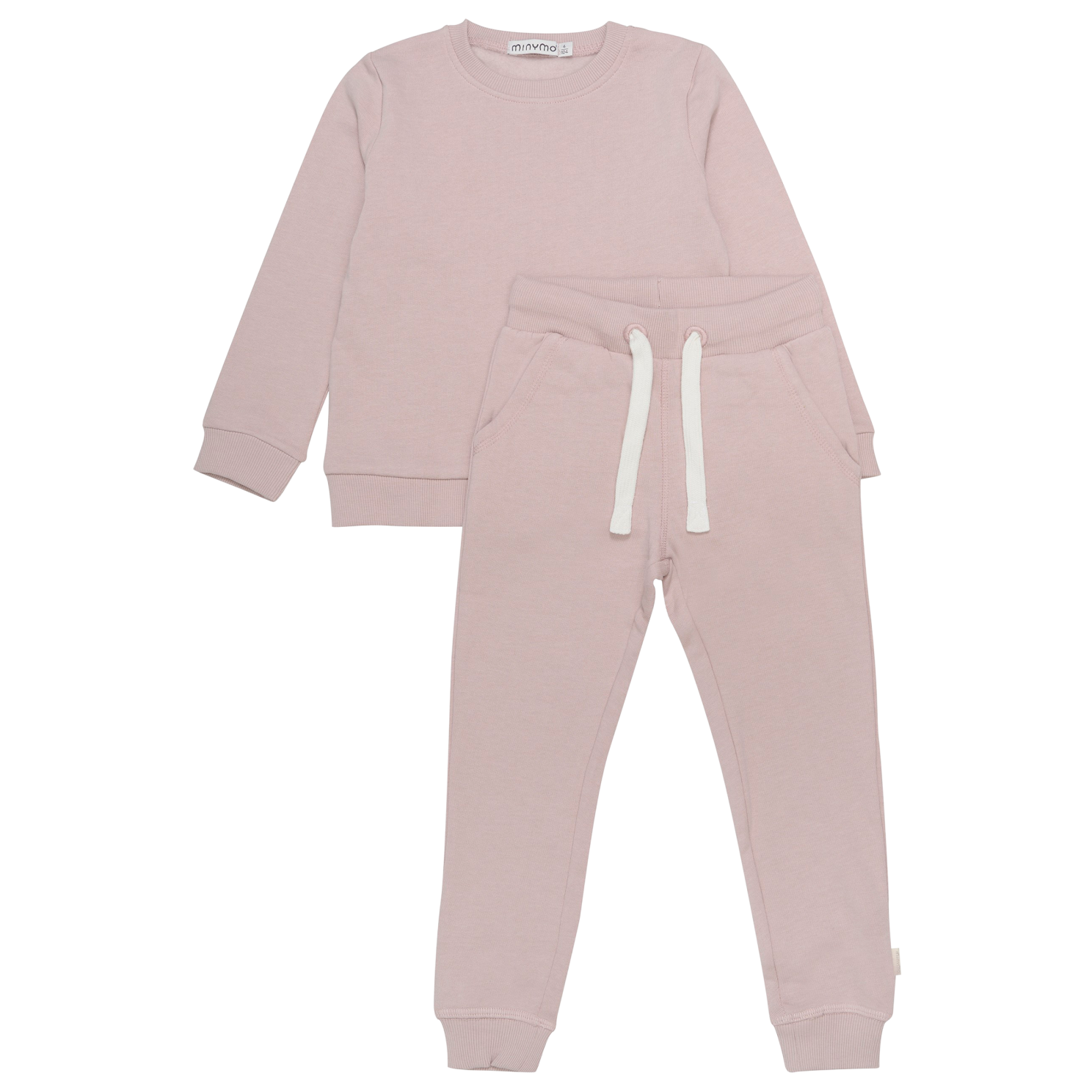 Minymo børne sweatsæt. Lækkert sweatsæt bestående af en langærmet bluse og bukser med blød børstet inderside. Sweatshirten har rund halsudskæring samt ribkant ved hals, hofte og ærmegab. Bukserne har elastik og bindebånd i taljen, to lommer samt ribkant v.