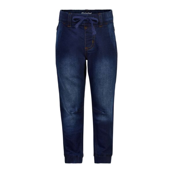 Minymo drenge bukser.Lækre stretchy bukser i jeans-look med elastikkant i buksebenene. Bukserne har bæltestropper, fire lommer og snøre. Bagpå er der to baglommer og foran to skrå lommer..