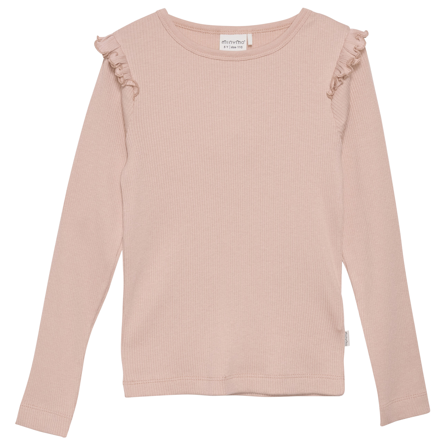 Minymo langærmet bluse med flæser på skulderne. Blusen er ensfarvet og i rib materiale..