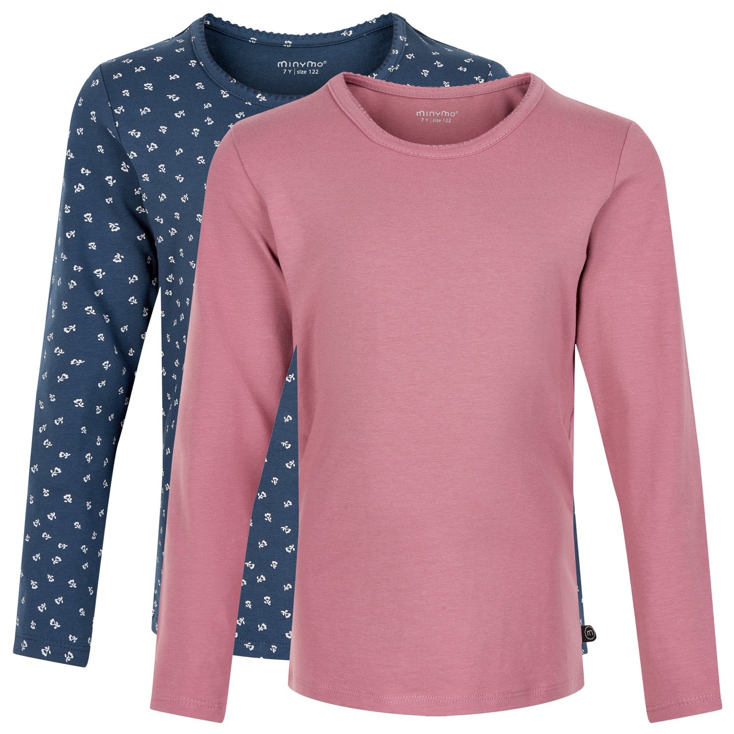 Minymo langærmet T-shirt 2-pak. Super lækre bluser med lange ærmer og fine detaljer i et virkelig blødt og elastisk materiale. Den ene med mønster og den anden ensfarvet/meleret. Blusen har rund halsudskæring med hæklet kant..