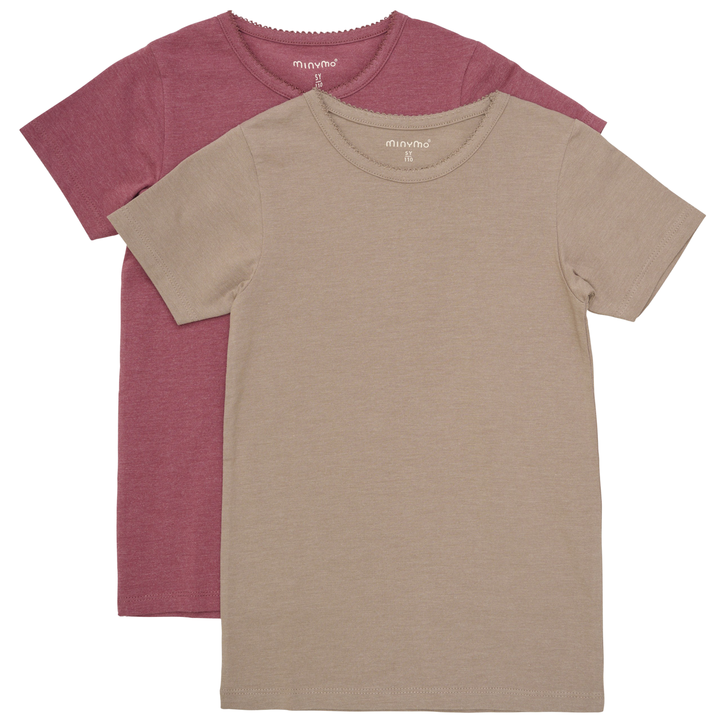 Minymo børne T-shirt 2-pak. Super fine T-shirt med rund halsudskæring med hæklet kant. Bluserne har korte ærmer. Den ene er med print og den anden ensfarvet/meleret. Bluserne har en løs pasform og er lavet i et lækker materiale med en masse stretch..
