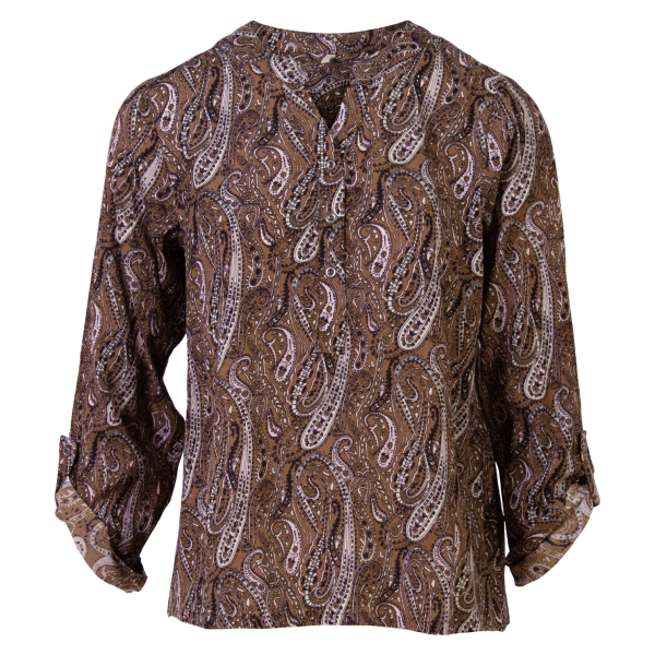 Dame bluse med all-over print. Blusen har V-udskæring, knapper ved brystet samt lange ærmer med mulighed for opsmøg. Blusen er længere bagtil..
