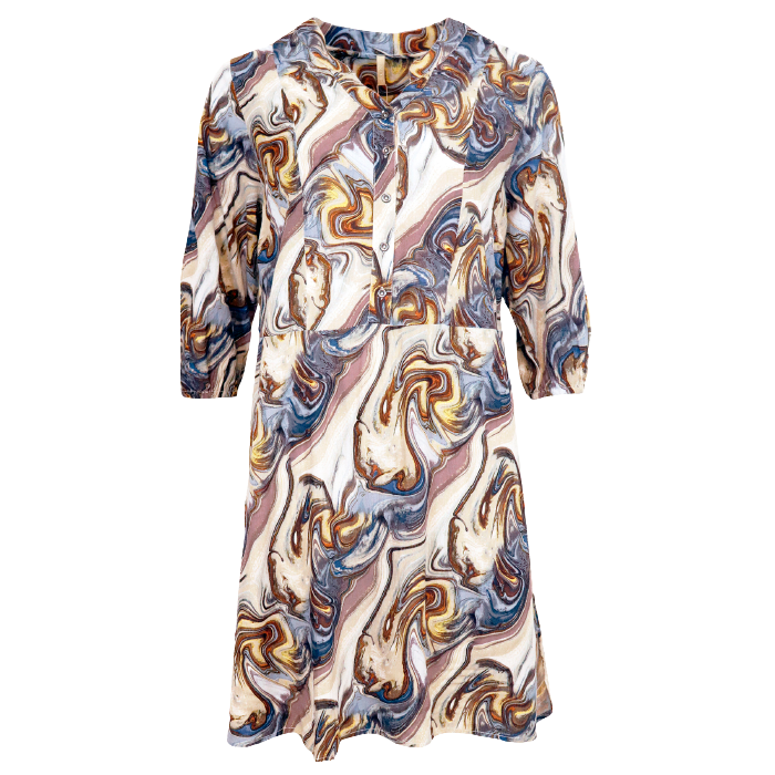 Dame tunika med all-over print. Tunikaen har V-udskæring, knapper ved brystet, lommer i siden samt trekvart ærmer med elastik. Tunikaen er længere bagtil..