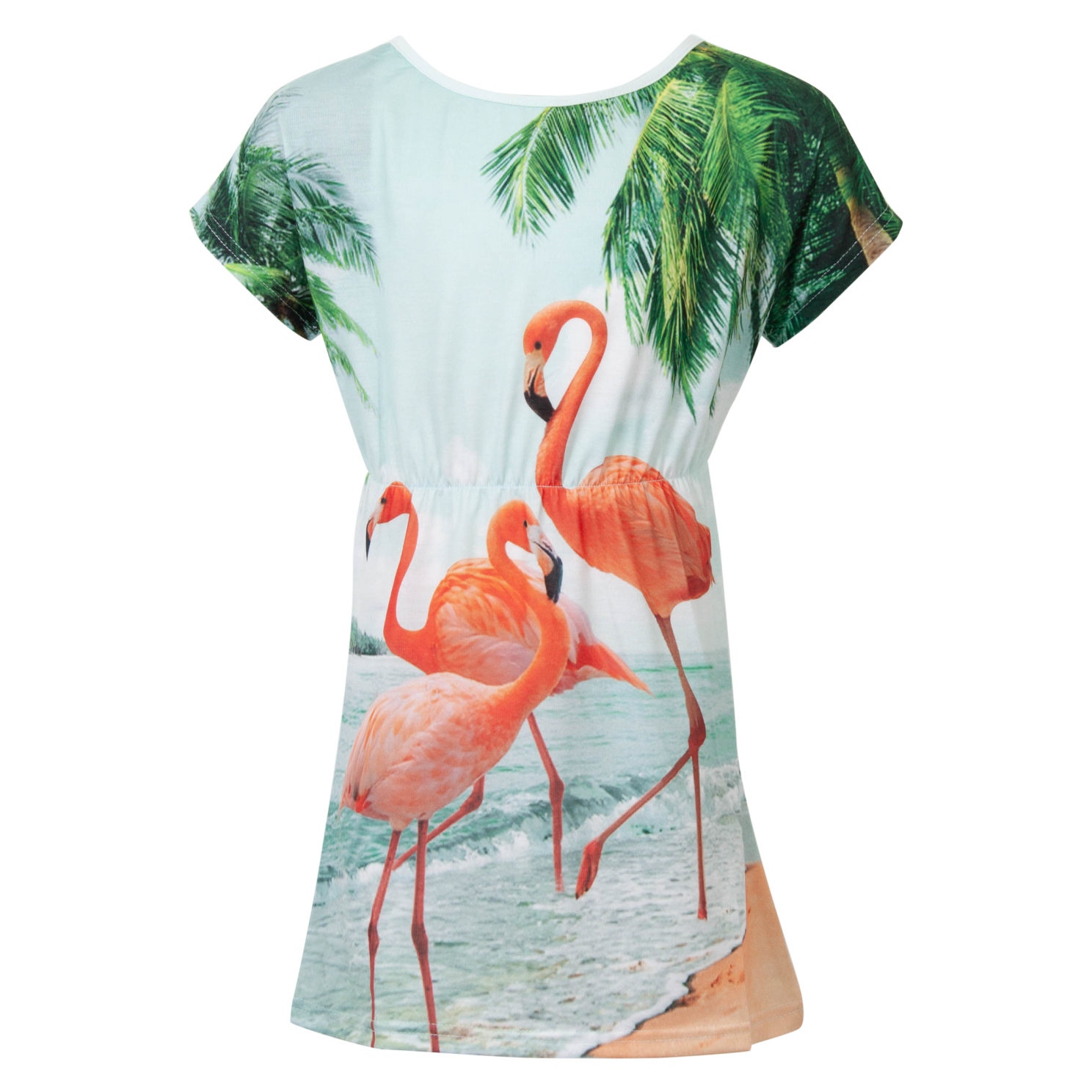 Fin pigekjole med flamingo print på fronten. Kjolen har korte ærmer og rund hals..