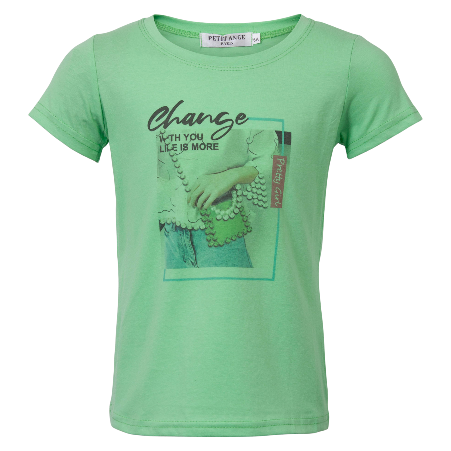 Pige T-shirten har print på fronten, samt rund haludskæring med en lille ribkant..