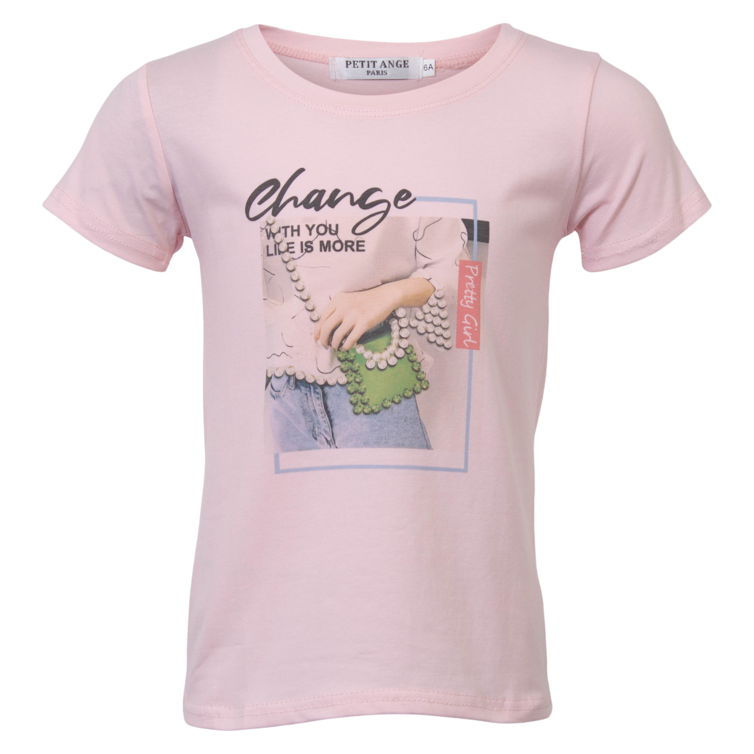 Pige T-shirten har print på fronten, samt rund haludskæring med en lille ribkant..