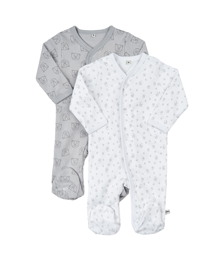 Pippi baby natdragt 2-pak. Langærmet heldragt i et sødt print med fødder og gennemgående knappelukning..