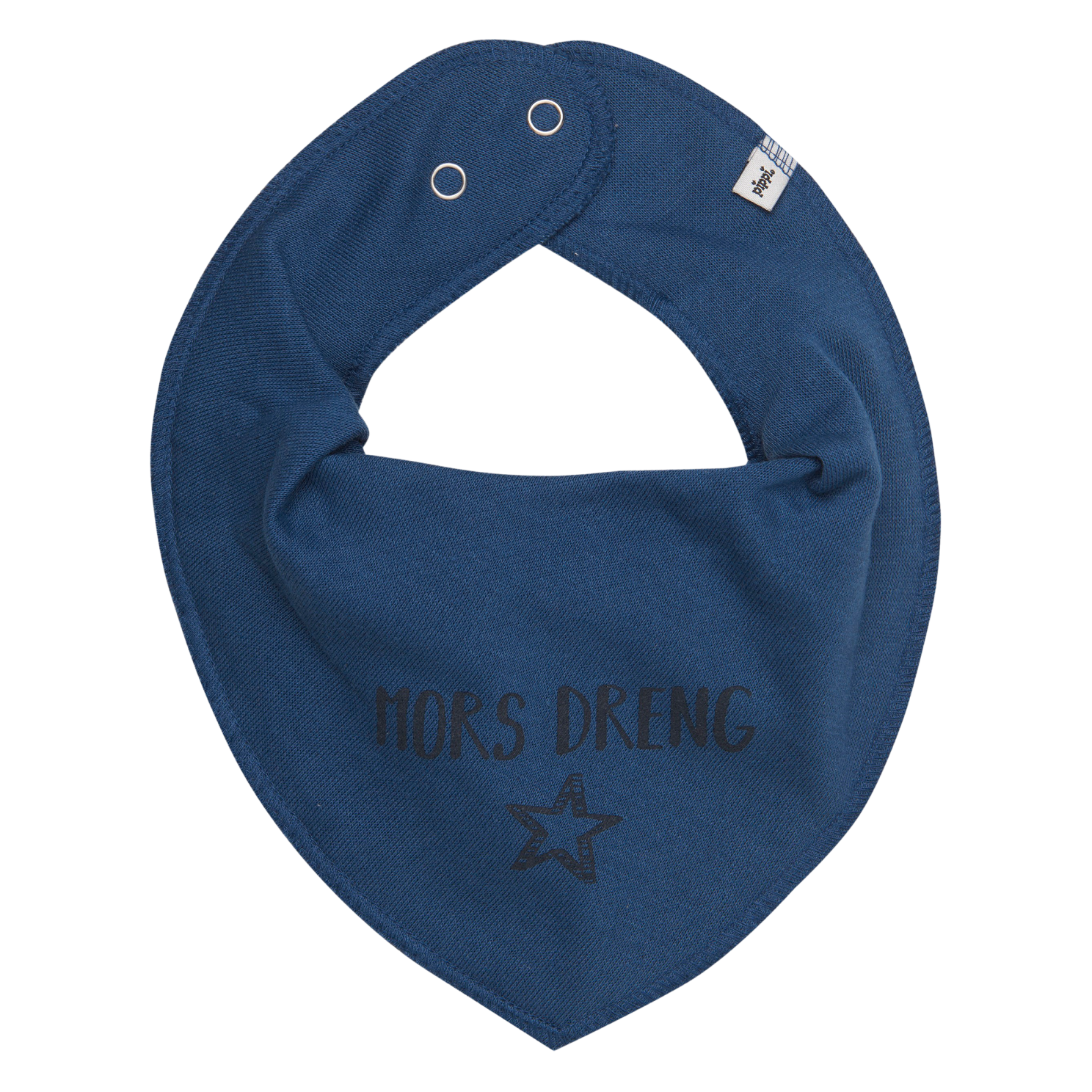 Savlesmæk med bandana inspireret look og teksten Mors dreng. Savlesmækken er lavet af økologisk bomuld og har justerbar knaplukning i nakken..