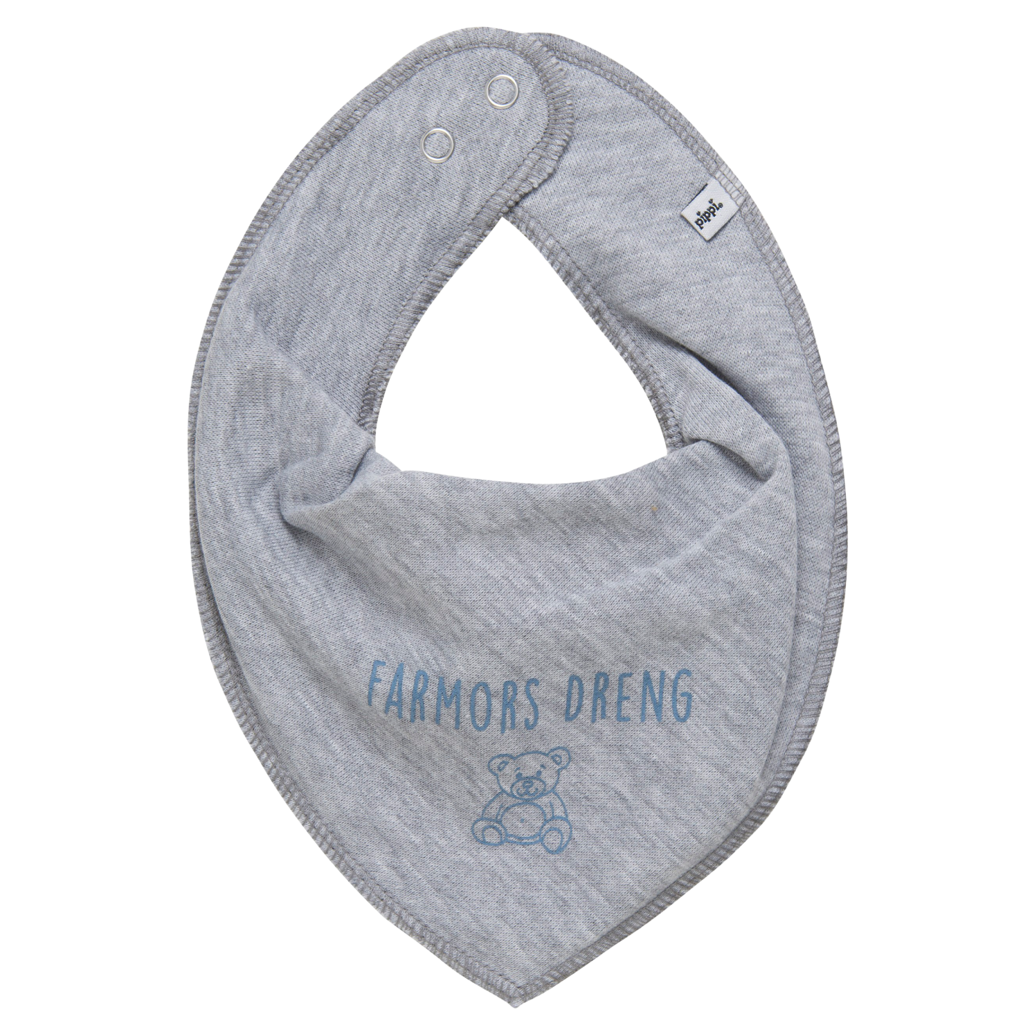 Savlesmæk med teksten Farmors dreng. Savlesmækken er lavet af økologisk bomuld og har justerbar knaplukning i nakken..