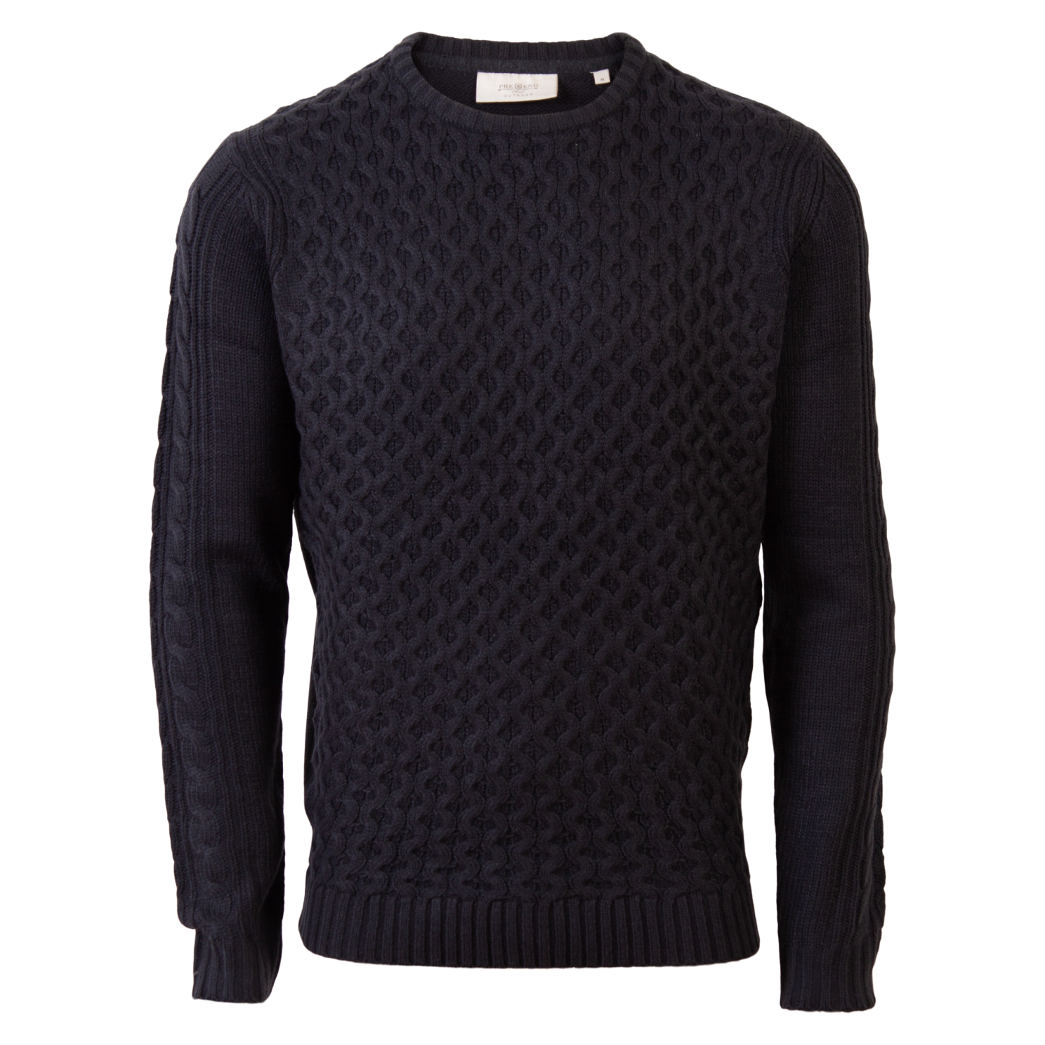 Pre End herre striktrøje med rund halsudskæring, strikket mønster på fronten og langs de lange ærmer. Striktrøjen har en ribkant forneden..