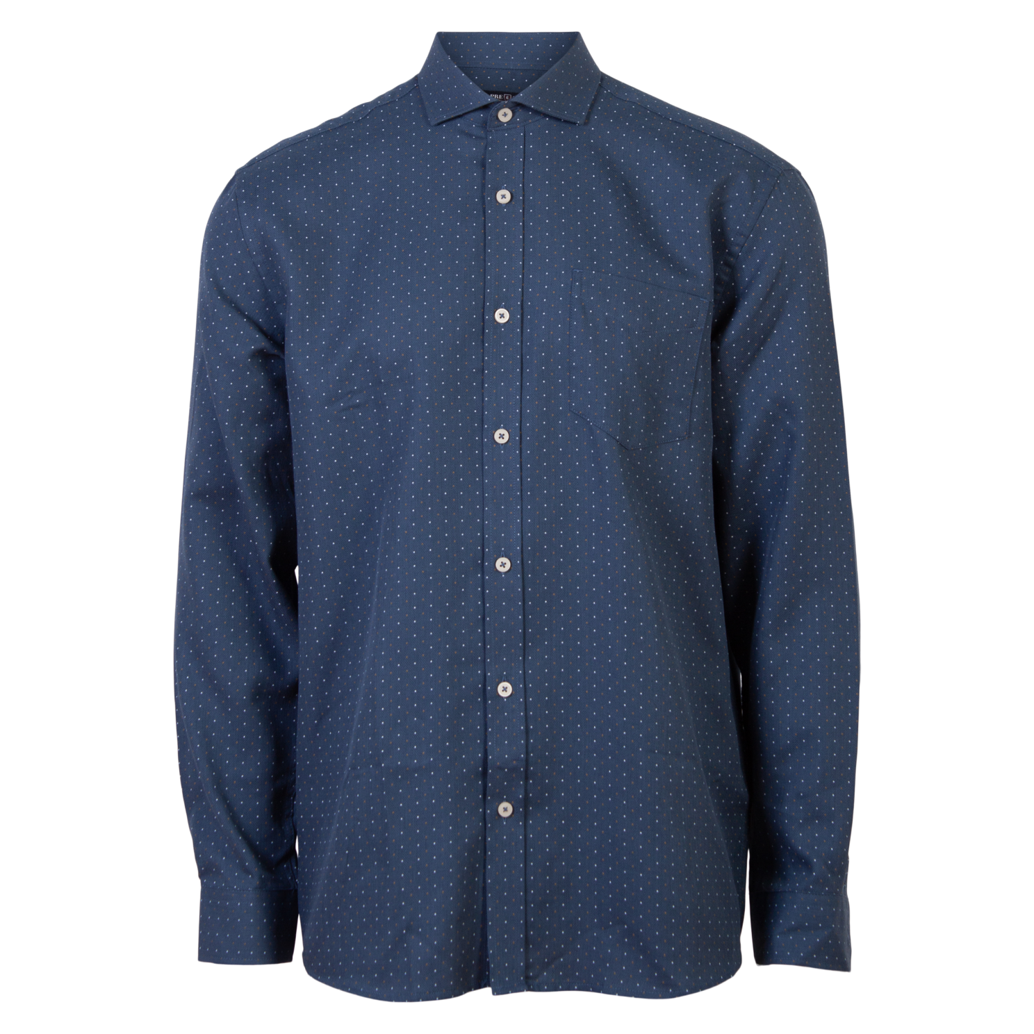 Pre End herre skjorte. Skjorten er blå med små prikker i guld og hvid og har gennemgående knappelukning. Der er knapper i ærmerne, som gør at den kan tilpasse sig om armene. Skjorten har en brystlomme..