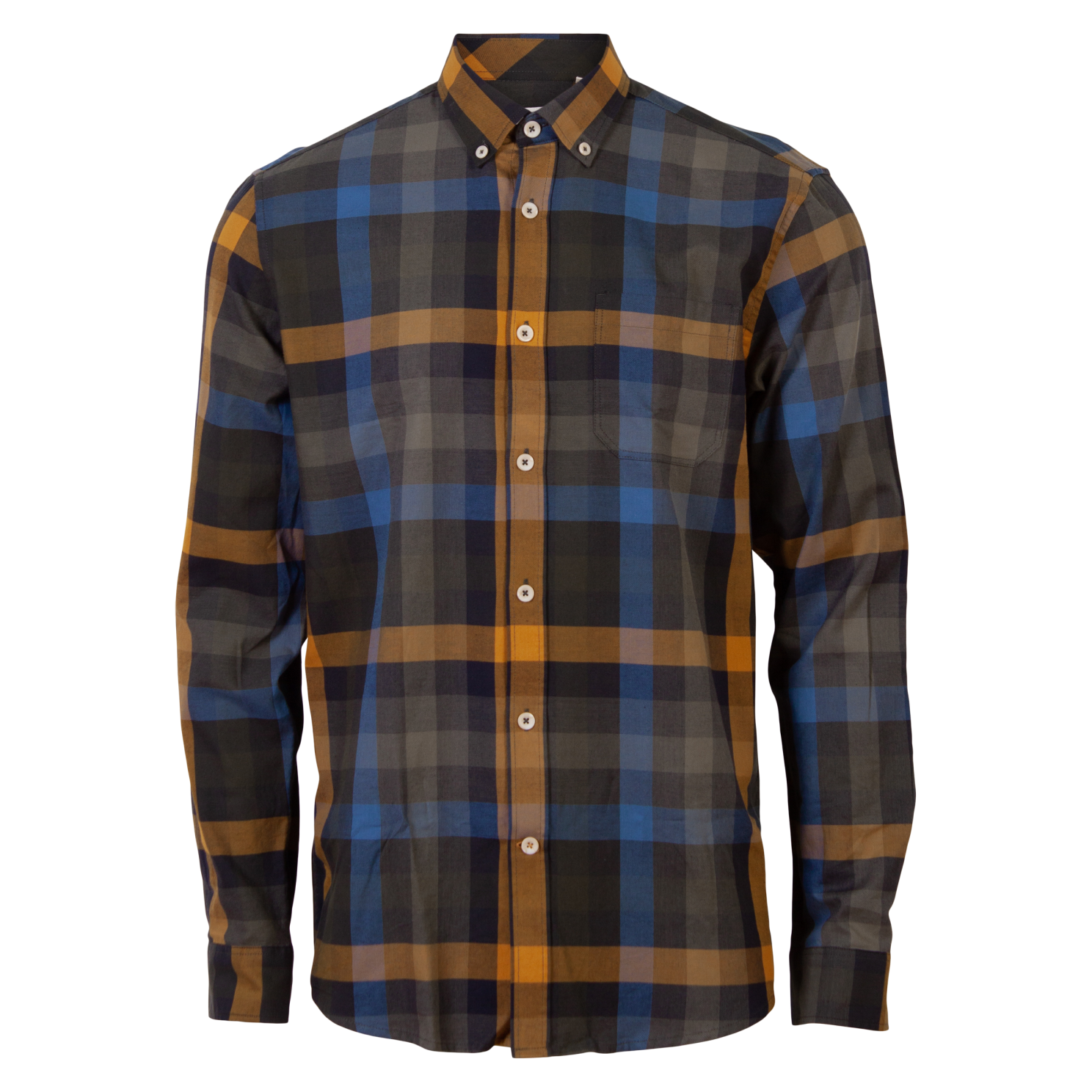 Pre End South herre skjorte. Skjorten har gennemgående tern og mønster i grønne, blå og gule nuancer samt gennemgående knappelukning. Der er knapper i ærmerne, som gør at den kan tilpasse sig om armene. Skjorten har en brystlomme..