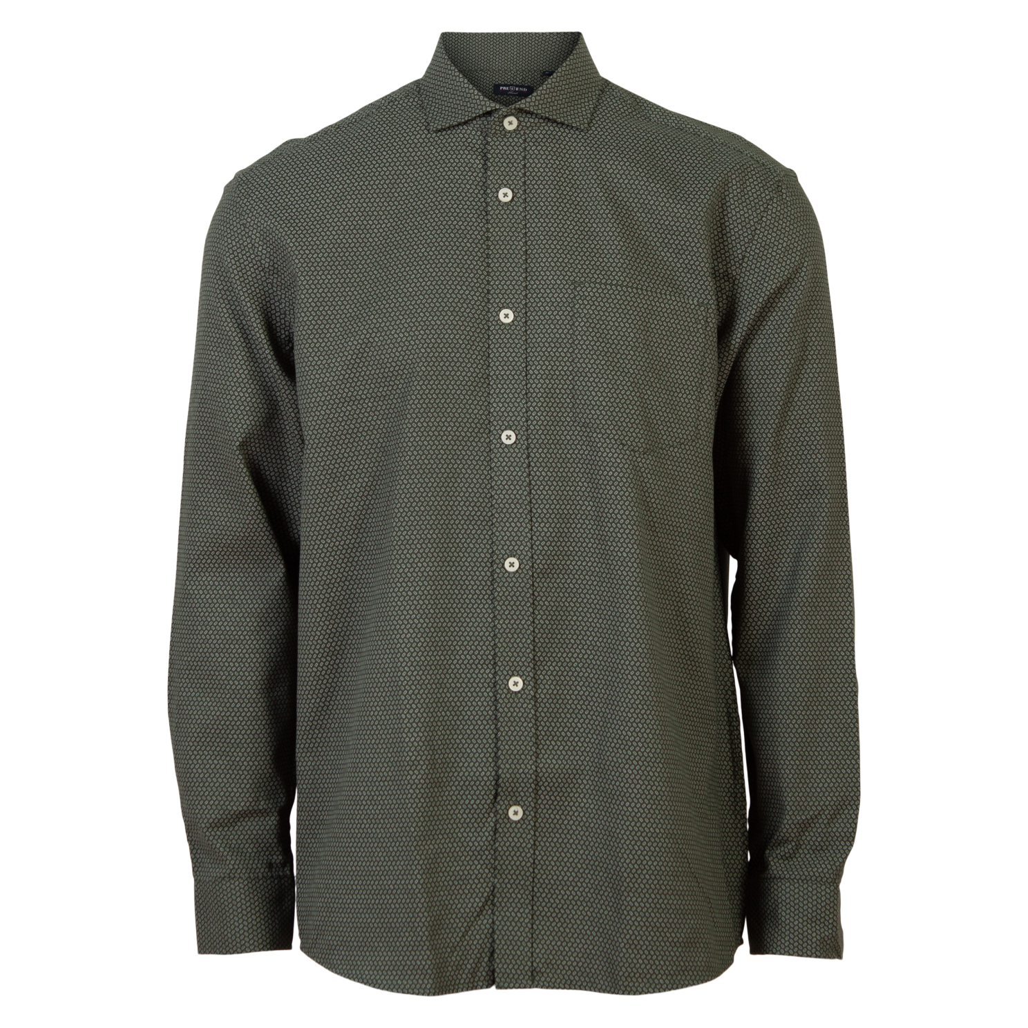 Pre End herre skjorte. Skjorten er grøn med små, hvide detaljer og har gennemgående knappelukning. Der er knapper i ærmerne, som gør at den kan tilpasse sig om armene. Skjorten har en brystlomme..