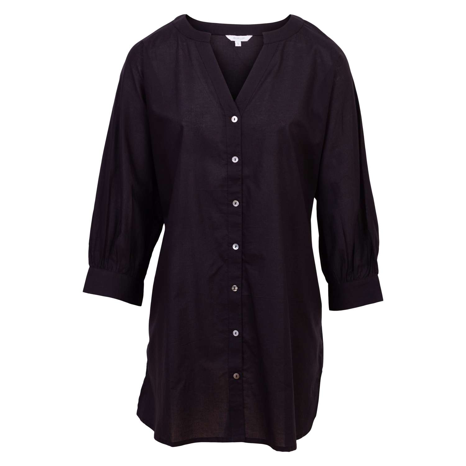 Sirup dame tunika.Tunikaen har gennemgående knappelukning, med en v-hals ved brystet. Tunikaen er længere bagpå end den er foran, samt har den brede ærmer..