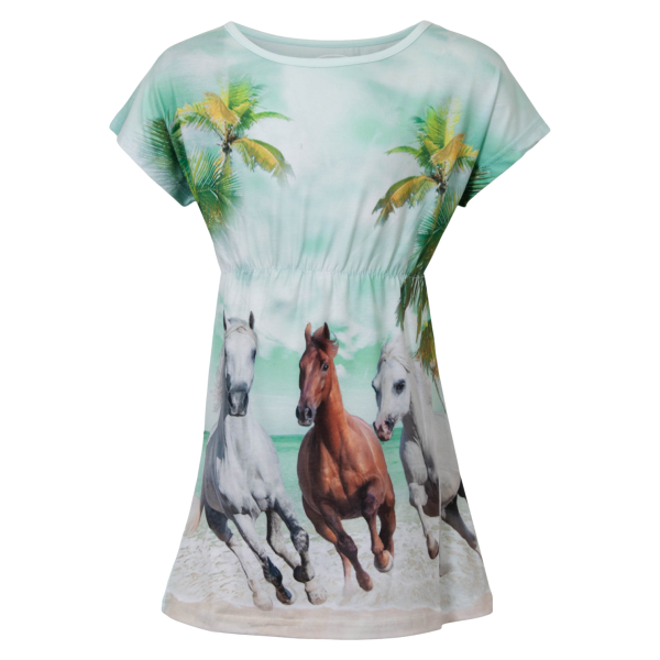 Fin pigekjole med heste print på fronten. Kjolen har korte ærmer og rund hals..