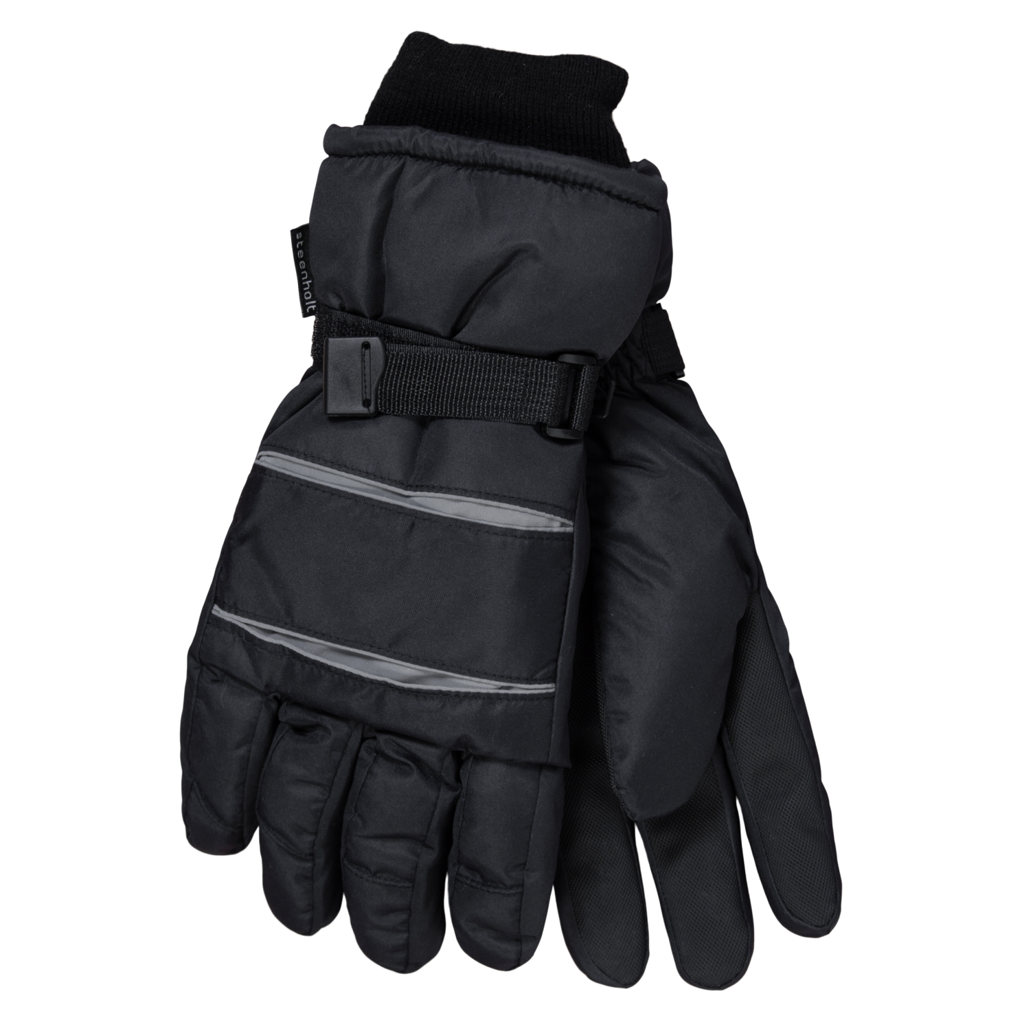 Steenholt handsker. Praktiske handsker med fingre og velcrobånd til at stramme handskerne ved håndleddet. Vindfang i ribstof, så der lukkes af for kulden. Refleksdetaljer på håndryggen. Indeni er de bløde og varme..