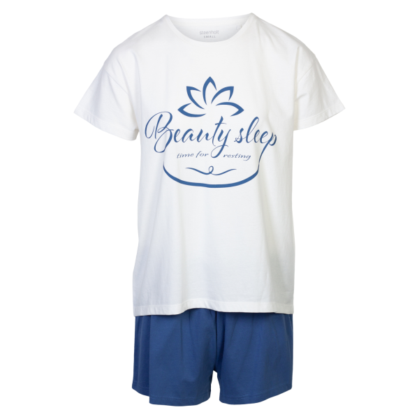 Steenholt Female Indy dame nattøjBehageligt natsæt bestående af en t-shirts og et par shorts. T-shirten har print på fronten, korteærmer og rund halsudskæring. Shortsene er uden lommer og har elastik og bindebånd i taljen..