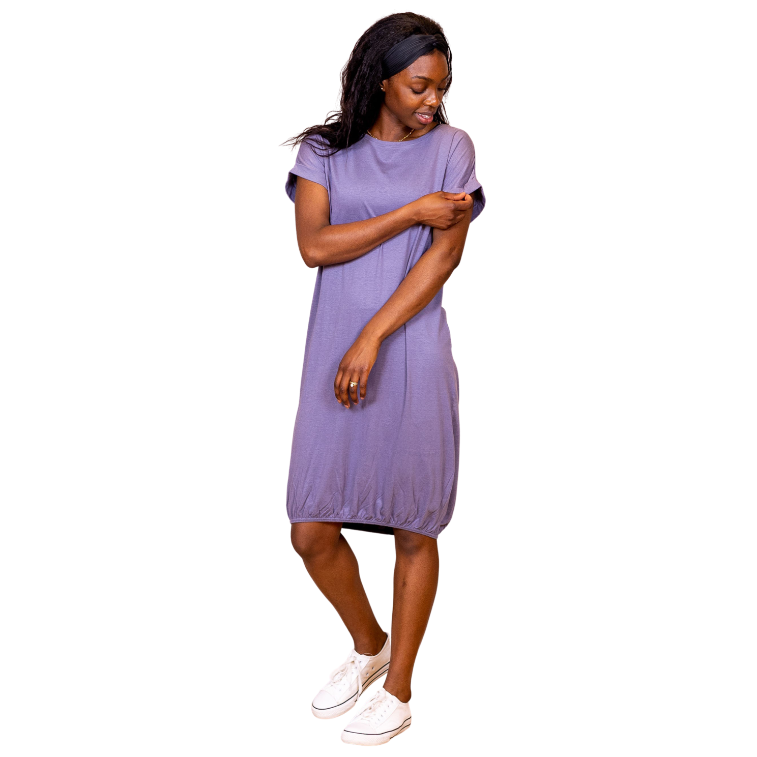 Steenholt Female Nima dame kjole.Flot kortærmet kjole med opsmøget effekt ved ærmet. Kjolen er knælang, har rund halsudskæring samt elastik kant i bunden som giver en flot feminin silhuet..