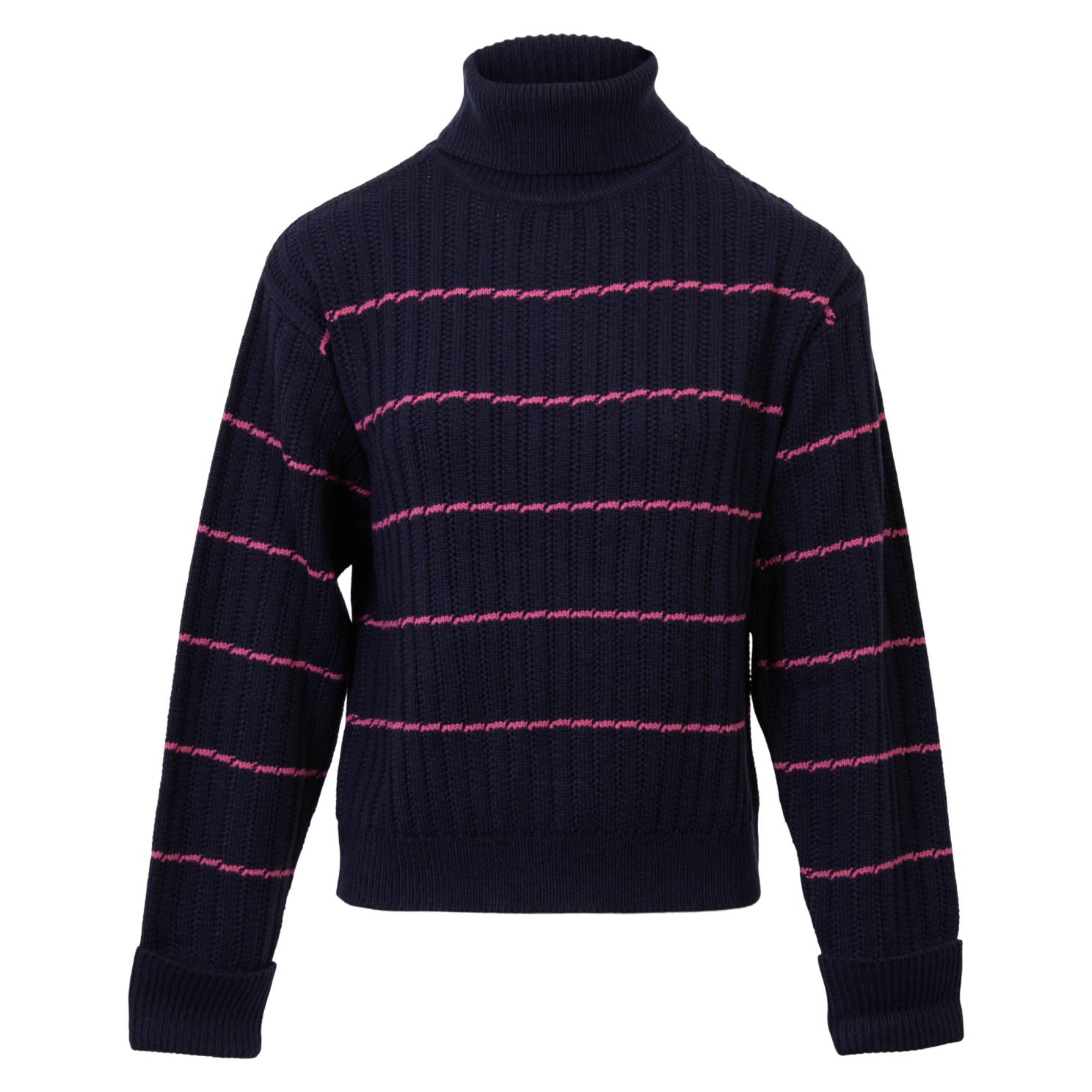 – Striktrøje med rullekrave- Kraftig, blød ribstrik – Striber i kontrastfarve- Opsmøget ribkant ved ærmet.