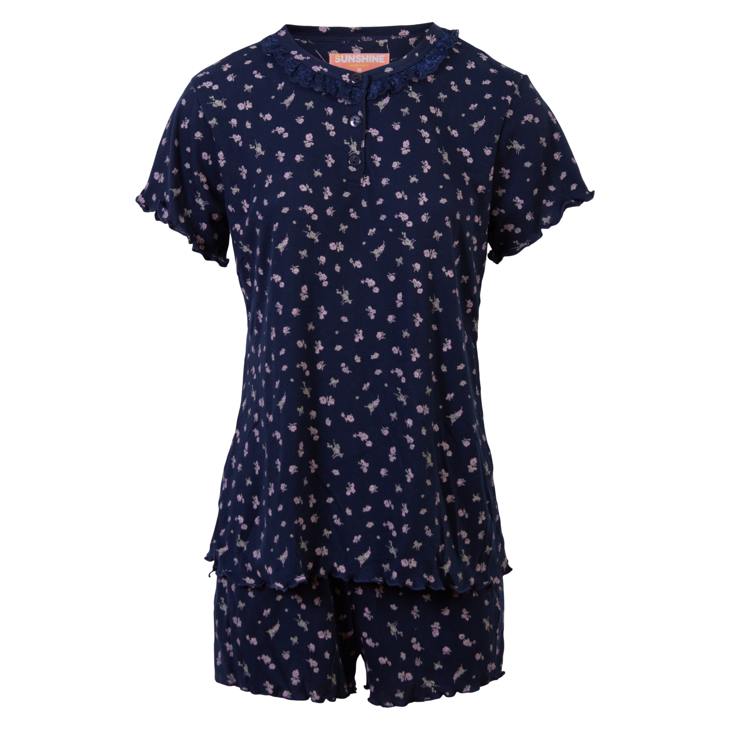 Sunshine dame nattøj. T-shirten har flæser i bunden, blonde om halsen og knapper ved brystet. Shortsene har elastik i taljen, som gør at shortsene tilpasser sig om livet. Shortsene har flæser i bunden..