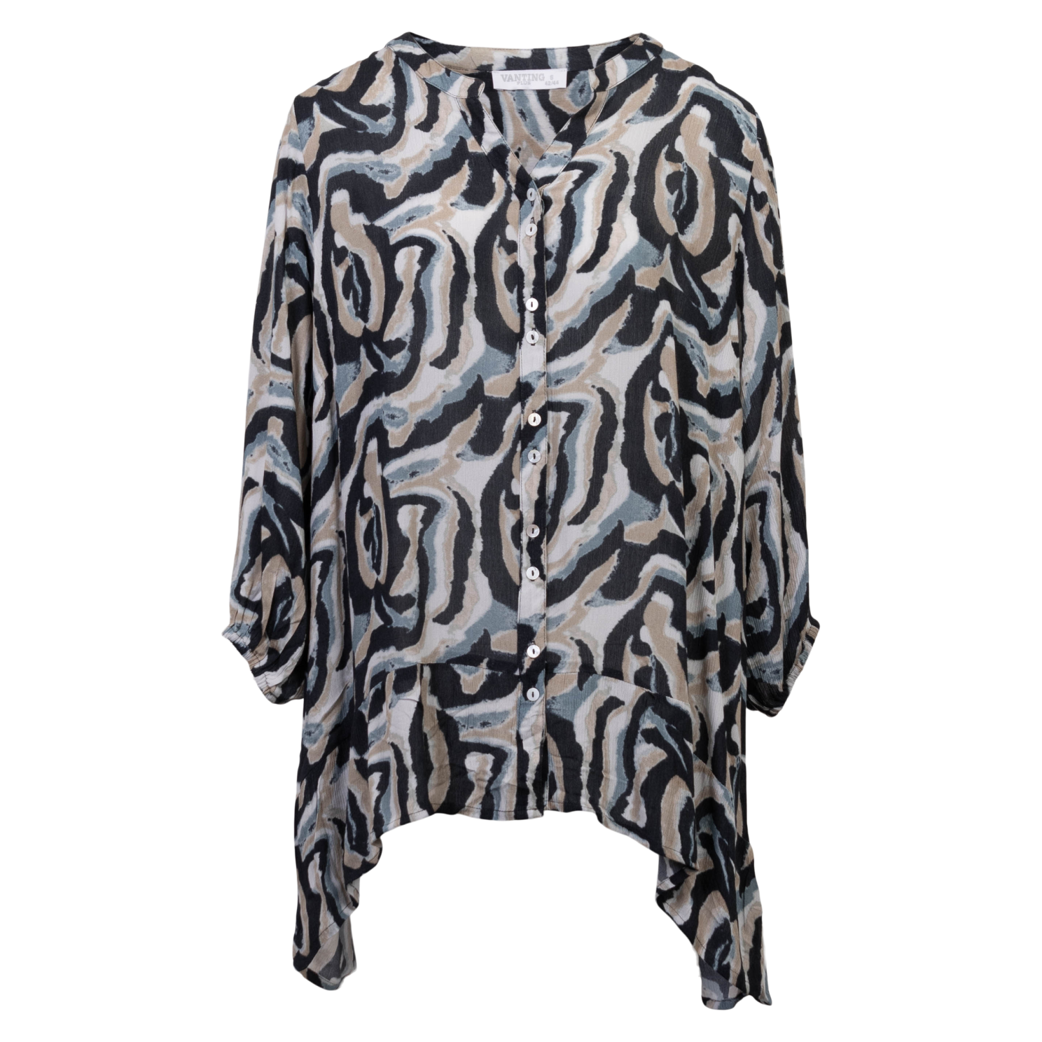 Vanting bluse med all-over print. Blusen er i blødt og luftigt materiale, med knappelukning ned langs trøjen. Blusen har 3/4 ærmer, med elastik forneden, som skaber et poset look. Blusen har flæsedetaljer i bunden af trøjen..