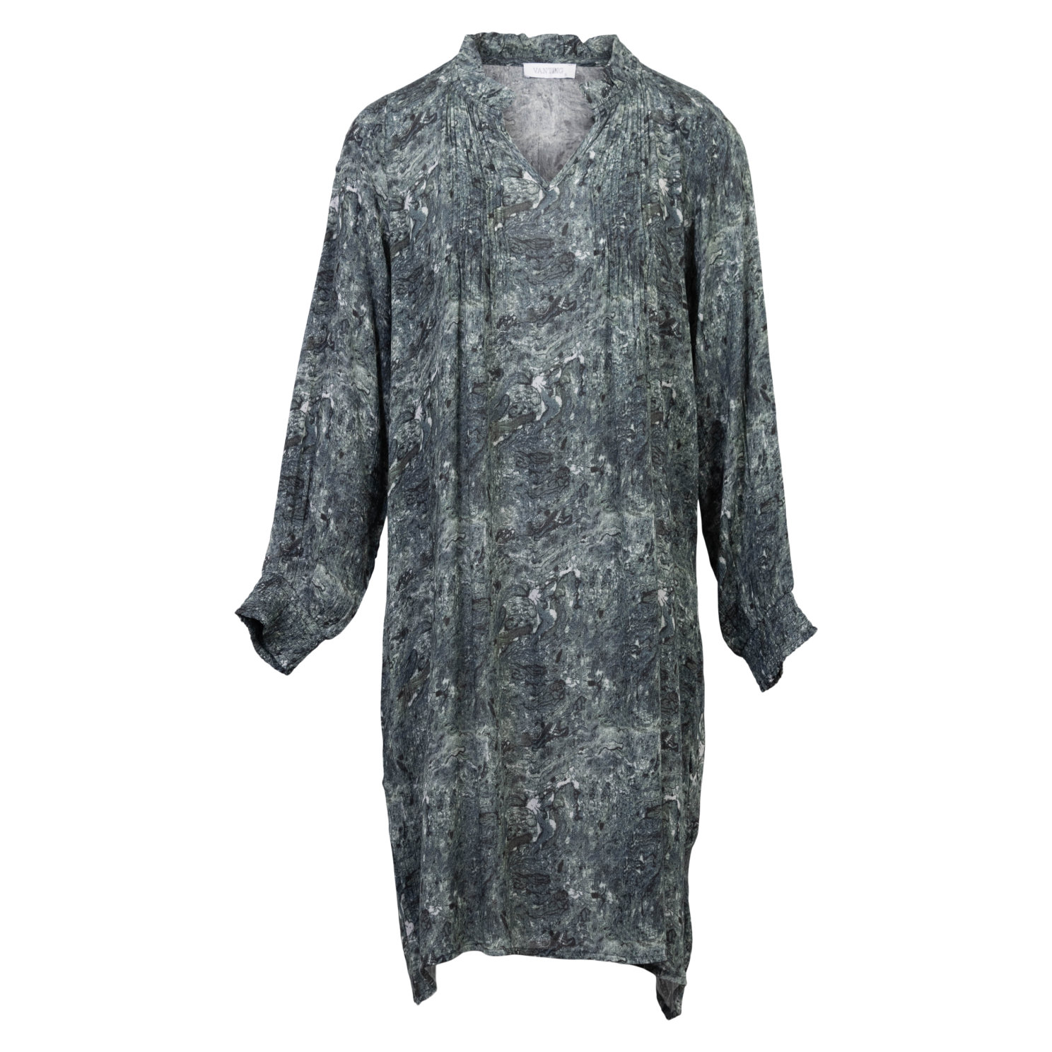 Vanting kjole med all-over print i blødt og luftigt stof. Kjolen har flæser ved halsen, samt foldedetaljer ned langs brystet. Kjolen har elastik ved ærmerne..