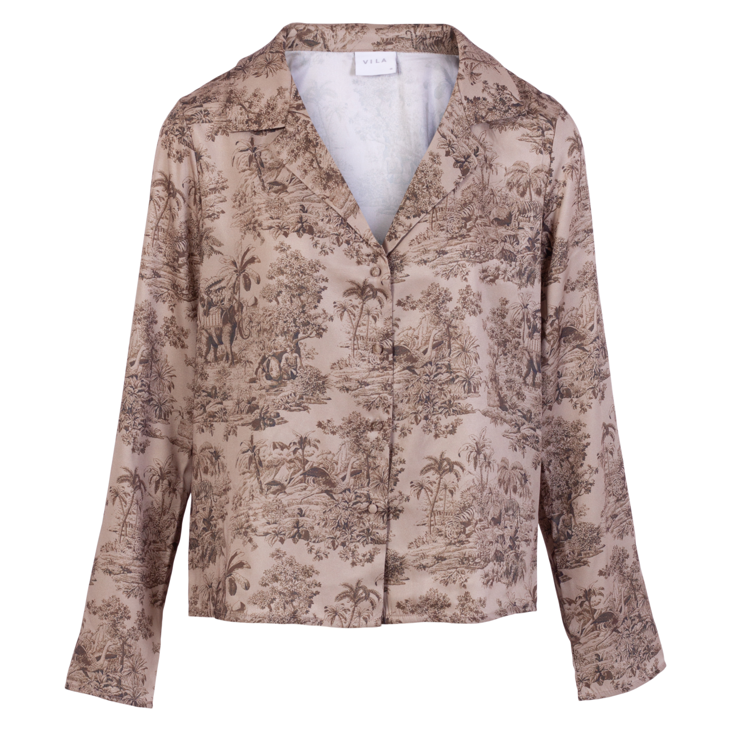 Vila dame skjorte. Smart skjortebluse med jungle print. Skjorten har en nedringet V-udskæring og er lavet i et silke-look..